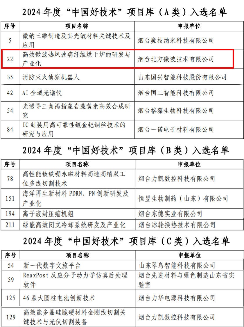 烟台北方微波技术有限公司凭借“高效微波热风玻璃纤维烘干炉的研发与产业化”项目,从众多参评技术中脱颖而出,成功入选“中国好技术”A类项目库,彰显了其在工业微波能应用领域的卓越创新实力。